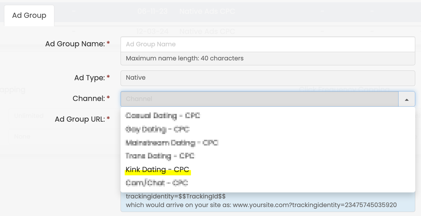Once you’ve created your campaign and made your targeting settings, go to the Ad Group level, select the Channel Kink Dating and set your CPC bid. Please note that Kink traffic is available exclusively as Native Ads, and a minimum CPC of €0.15 is required to include all major publishers.